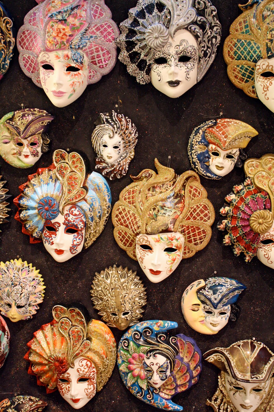 Ohhhh, I like them all, but especially the three-lamp off-centered "street light" - that is an amazing photo. And the one with the gondola in foreground is a unique angle! And the hanging baubles are fascinating - I can almost make out your image taking the photo in some of them! The one of the masks keeps drawing me back to it. All wonderful shots!